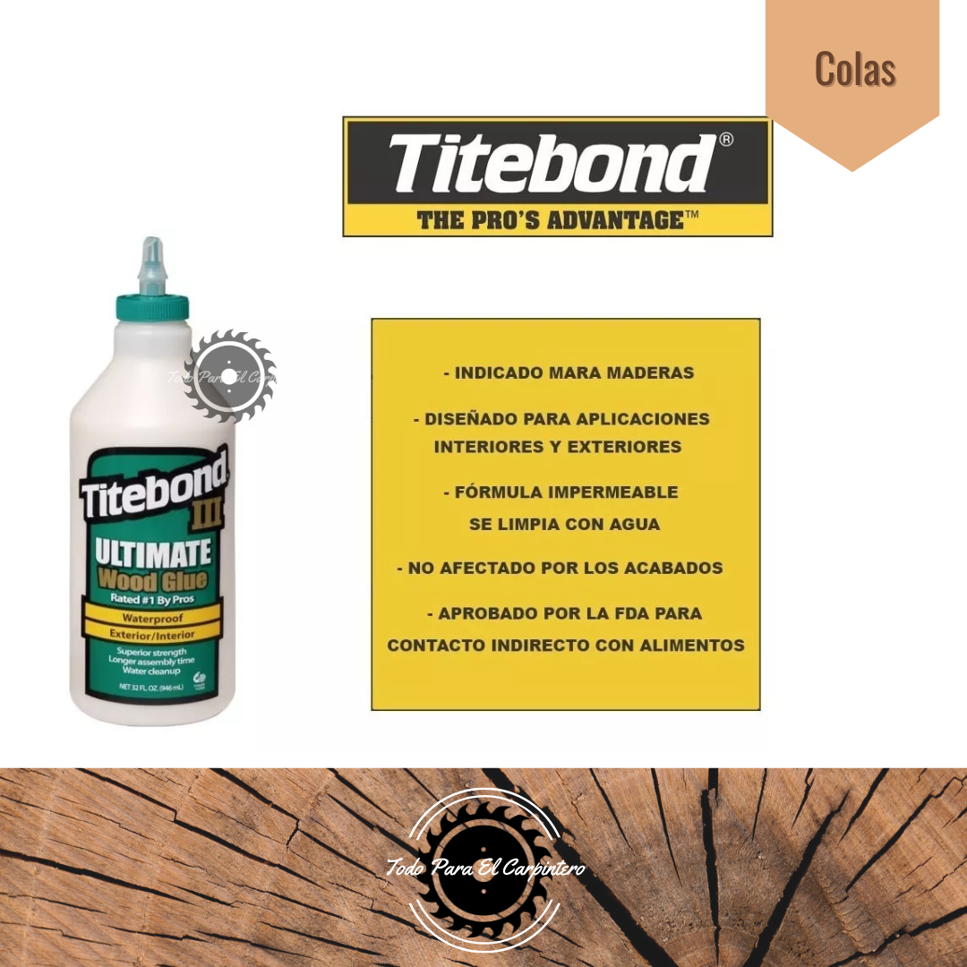 Titebond III Ultimate Wood Glue es el primer pegamento para madera de un solo componente que se limpia con agua y que se ha probado a prueba de agua. La fórmula impermeable pasa la especificación de resistencia al agua ANSI / HPVA Tipo I y ofrece una fuerza de unión superior, un tiempo de ensamblaje abierto más prolongado y una temperatura de aplicación más baja. Titebond III no es tóxico, no contiene solventes y se limpia con agua; es más seguro de usar que los tradicionales pegamentos para madera a prueba de agua. Proporciona una adherencia inicial fuerte, se lija fácilmente sin ablandarse y está aprobado por la FDA para contacto indirecto con alimentos (tablas de cortar). Lo último en pegamentos para madera, ideal para aplicaciones tanto en interiores como en exteriores.